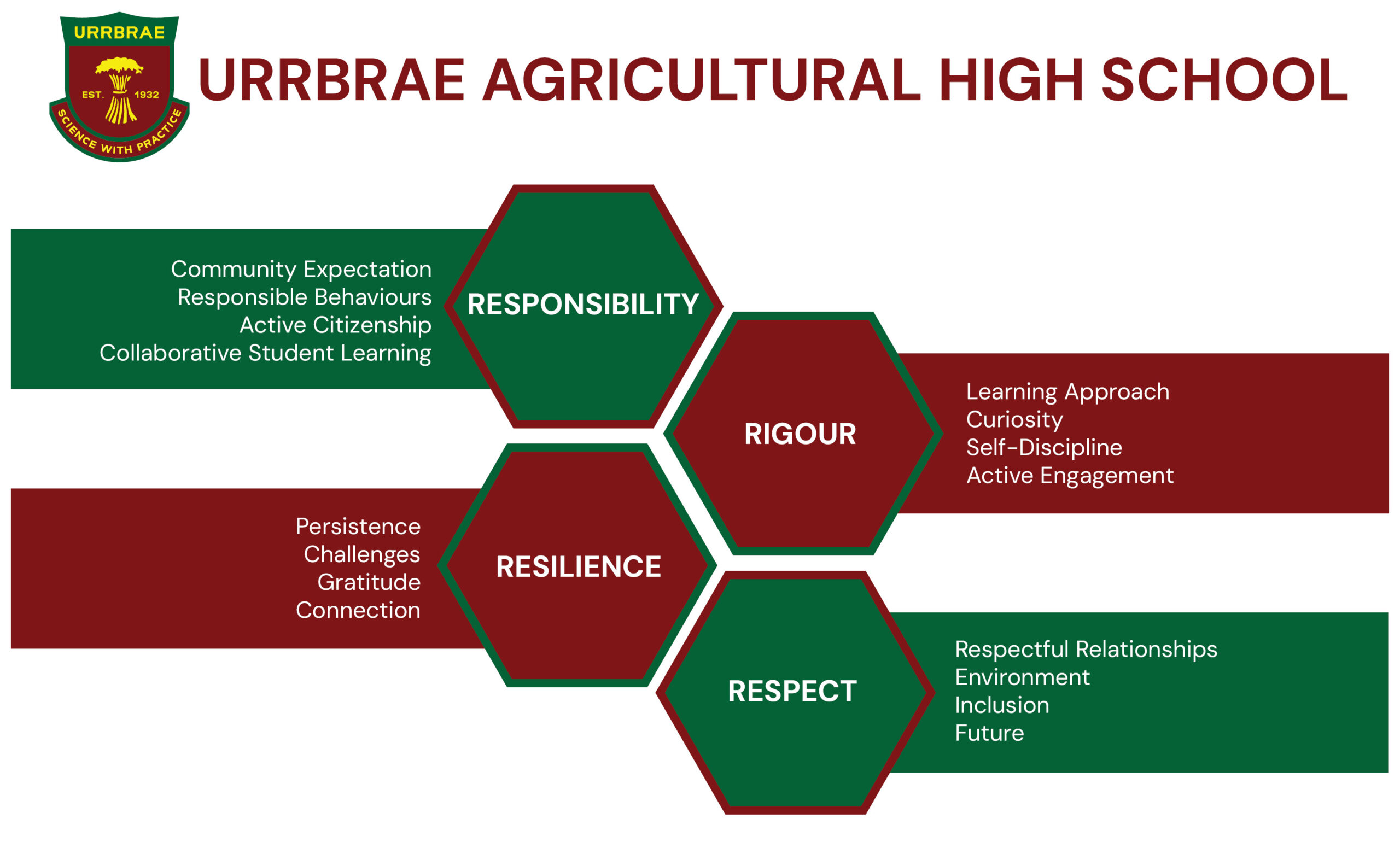 Our Urrbrae school values are Respect, Rigour, Responsibility and Resilience.